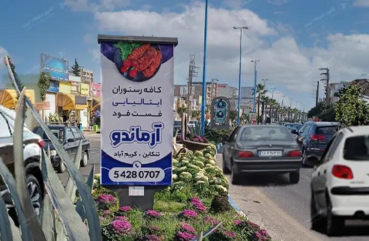 تابلو تبلیغاتی بین بلواری در تنکابن در دو وجه به ابعاد 2 متر قرار دارد.